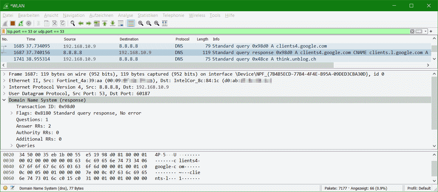 19:12:08.865466 IP 8.8.8.8.53 > 192.168.10.9.42852: 45514 2/0/1 A 108.177.119.108, A 108.177.119.109 (75)