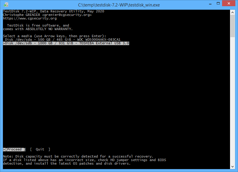 Nach dem herunterladen und entpacken der ZIP-Datei wechselt man in das Verzeichnis testdisk-7.2-wip.win64, hier die Datei testdisk_win.exe mit einem Doppelklick ausführen. Zum aktuellen Zeitpunkt beim Erstellen dieses Post, ist die TestDisk 7.2 WIP (Work In Progress) verfügbar. Unter Linux wie bei Debian/Ubuntu erfolgt die Installation mit dem Packet Manager apt install testdisk, bei CentOS/Fedora mit dnf install testdisk qphotorec.