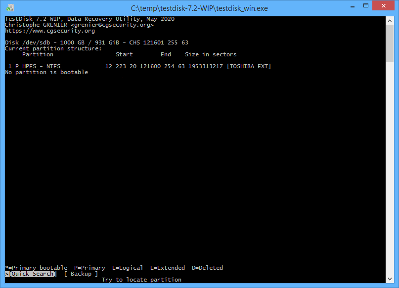 TestDisk ist eine leistungsstarke kostenlose Software für Datenwiederherstellung und Datenrettung. Wenn man mit den Windows-Bordmittel am Ende angelangt ist, kann TestDisk hier weiterhelfen, das Tool ist in erster Linie entwickelt, um verlorene Partitionen wiederherzustellen und/oder nicht bootende Festplatten wieder bootfähig zu machen, wenn Symptome auftreten die durch fehlerhafte Software verursacht werden, oder durch Viren oder menschliche Fehler, wie das versehentliche Löschen einer Partitionstabelle erfolgte. TestDisk ermöglicht eine einfache Wiederherstellung von Partitionstabellen.