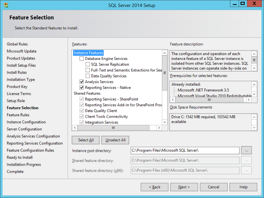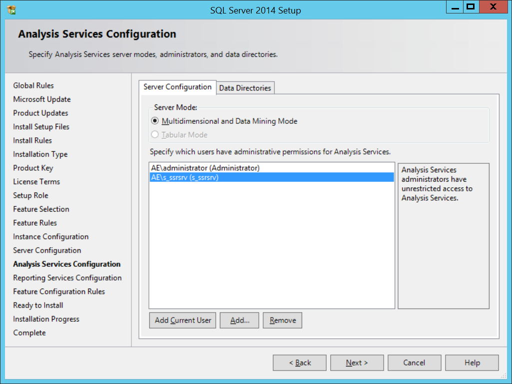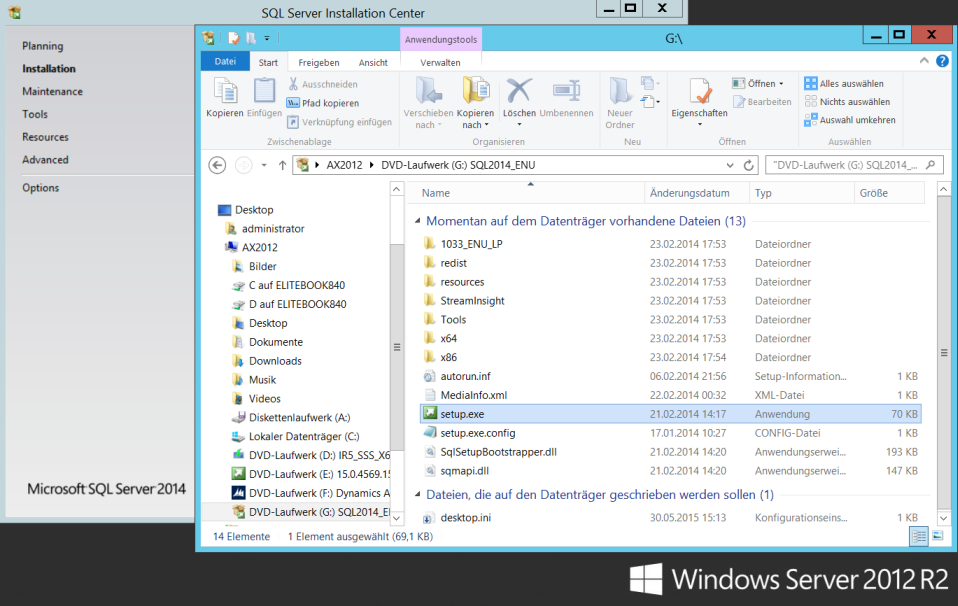 Dieser Post beschreibt die Bereitstellung der SQL Server Reporting Services (SSRS) und SQL Server Analysis Services (SSAS) zu einer bereits installieren SQL Server Instanz. Die Installation findet auf einem Windows Server 2012 R2 statt, dieser als Virtuelle Maschine in einem VMware ESXi Host läuft. Das Installationsmedium ist ein Microsoft SQL Server 2014 dieses als ISO Image in der VM als Laufwerk G: gemountet ist.