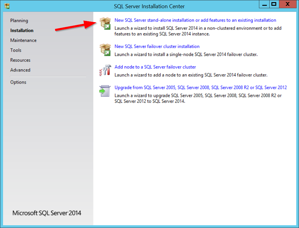 Nach akzeptieren der Lizenzbestimmungen fortfahren mit der Option New SQL Server stand-alone installation or add features to an existing installation.