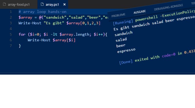 Beim programmieren kommen oft Arrays und Schlaufen-(Loops) zur Anwendung, so auch beim arbeiten mit PowerShell Scripts. In folgendem Beispiel werden 4 Array Werte angelegt, diese mittels der ID wieder aufgerufen werden.
