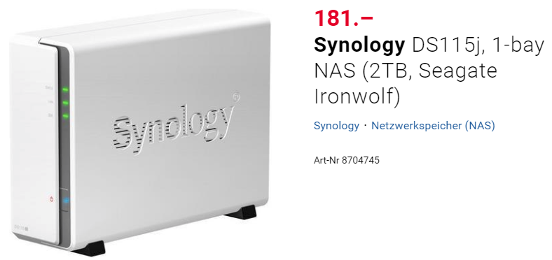 Was kostet die eigene Sicherheit ? bereits ab CHF 181.- gibt es bei digitec die Synology DS115j, Softbundle mit 2TB Seagate Ironwolf Festplattenspeicher, damit hat man alles was für Private Cloud-Computing benötigt wird.