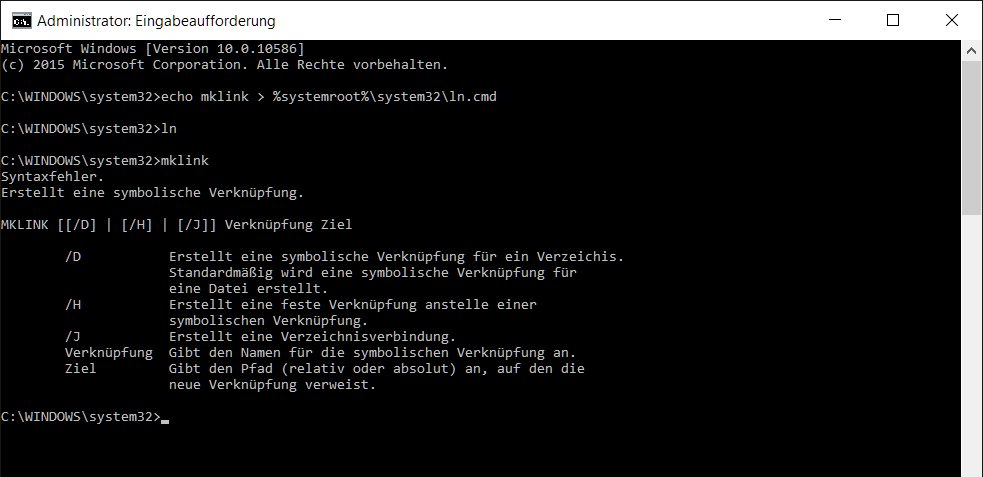 Möchte man jetzt noch den Kommandozeilenbefehl mklink mit dem Befehl ln ersetzen, geschieht dies mit echo dieses durch den pipe direkt die neue Datei ln.cmd erstellt.