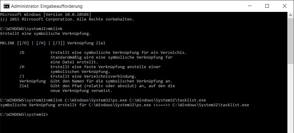 mklink %systemroot%\System32\ps.exe %systemroot%\System32\tasklist.exe mklink %systemroot%\System32\kill.exe %systemroot%\System32\taskkill.exe