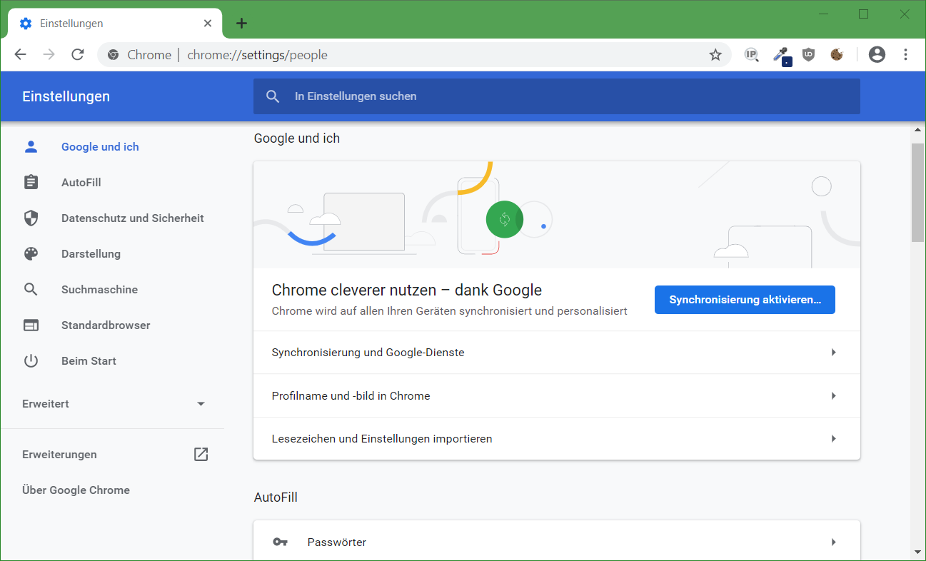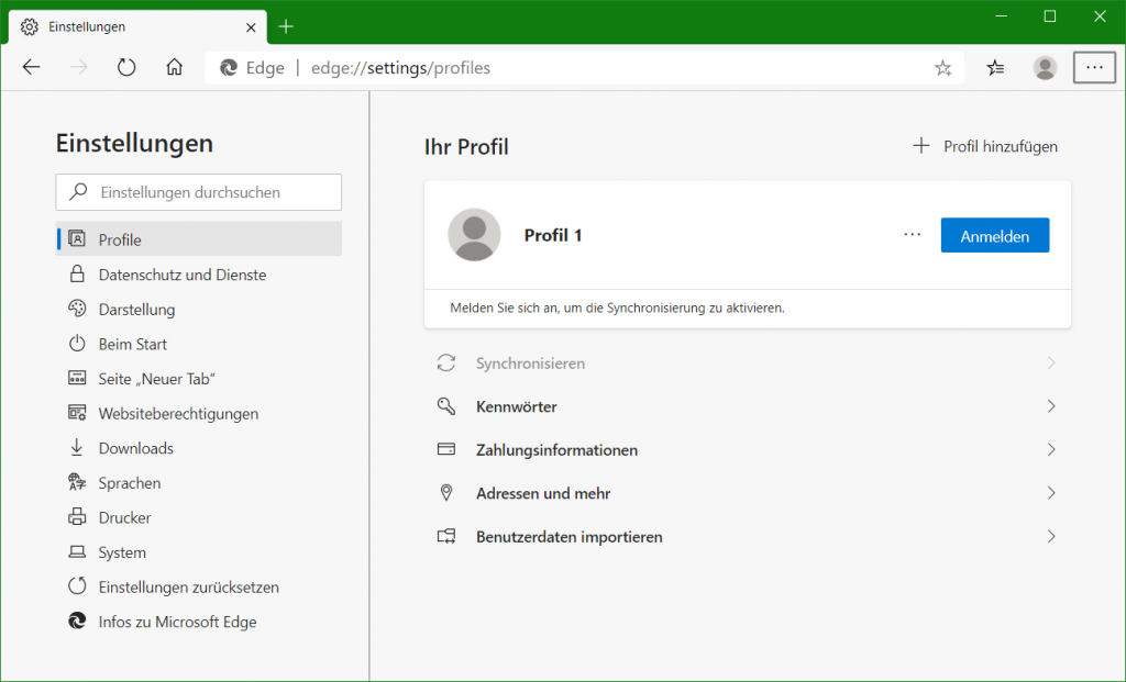Sucht man unterschiede zu den beiden Browser Edge und Chrome, zeigen sich wenige änderungen, so lassen sich die Edge Einstellungen mit der URL chrome://settings öffnen, dabei wechselt der Browser zu edge://settings/profiles