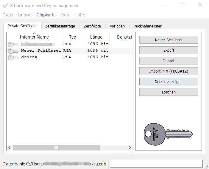 Bevor Schlüssel und Zertifikate generiert werden können, muss eine Datenbank mit <Ctrl+N> angelegt werden. Nach dem generieren eines Privaten Schlüssels kann ein neues Zertifikat erzeugt werden. Die Privaten Schlüssel sollten Passwort geschützt aufbewahrt werden. Wird ein Privater Schlüssel für unautorisierte verfügbar, ist das Zertifikat nicht mehr sicher und muss ersetzt werden.