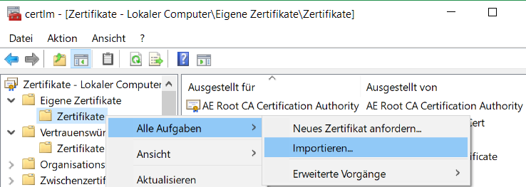 Das Zertifikat cert.crt wird anschliessend im Zertifikatspeicher importiert, dies zu Vertrauenswürdige Stammzertifizierungsstellen und zu den Eigenen Zertifikate.