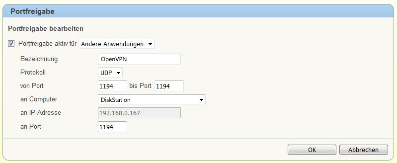 Dort wählt man Andere Anwendungen und gibt der Freigabe einen Namen. Wir verwenden UDP und nicht TCP und tragen bei von Port und an Port1194 ein, das ist der Port den OpenVPN verwendet. Bei Computer wird als Name das Synology NAS, die DiskStation eingetragen, auf dieser unser OpenVPN Server läuft, diesen man zuvor aus dem DSM Paket-Zentrum installiert und konfiguriert hat.