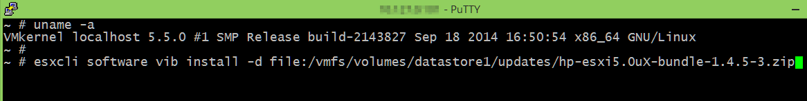 esxcli software vib install -d /vmfs/volumes/datastore1/update/hp-esxi5.0uX-bundle-1.4.5-3.zip