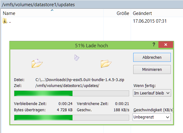 Um bei ESXi 5.x den in vSphere fehlenden Health-Systemstatus der Disk Arrays zu erhalten, muss das HP ESXi Offline Bundle for VMware ESXi 5.x installiert werden, hierzu das Bundle hp-esxi5.0uX-bundle-1.4.5-3.zip vom HP Support Center herunterladen und ohne zu entpacken, am besten mit WinSCP oder über den vSphere Client direkt auf den Datastore des ESXi Host laden.
