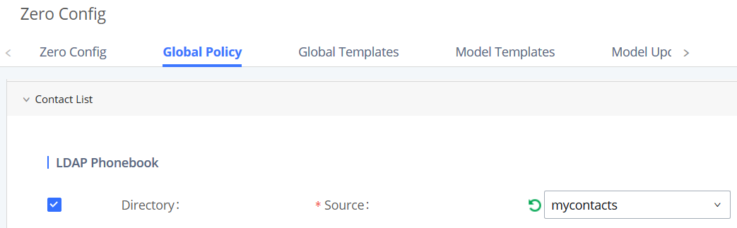 Für die Provisionierung des LDAP Phonebook mycontacts geht man zu Value-added-Features – Zero Config – Global Policy und öffnet Contact List und aktiviert Directory unter LDAP Phonebook, danach wählt man bei Source das zuvor angelegte Phonebook, hier mycontacts:
