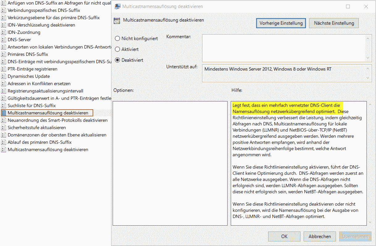 Die betreffende Einstellung Multicastnamensauflösung deaktivieren („Turn off smart multi-homed name resolution“) unter Computer Configuration => Administrative Templates => Network > DNS Client.